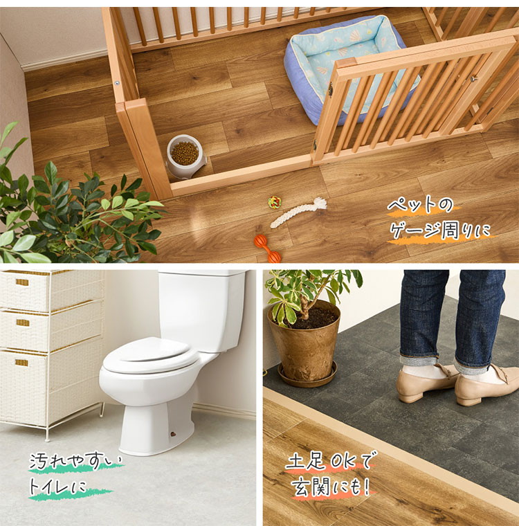 表面のコーティングによりワックスいらずでお手入れ簡単!防滑性・耐久性を備え傷がつきにくく、通常のクッションフロアより厚みがあり適度なクッション性でペットの足腰への負担を軽減します。抗菌・抗ウイルス機能付きで衛生面も安心。約90cm幅のマットサイズで使いやすく、カットもOK。また、複数枚を並べてお部屋に敷き詰めても◎