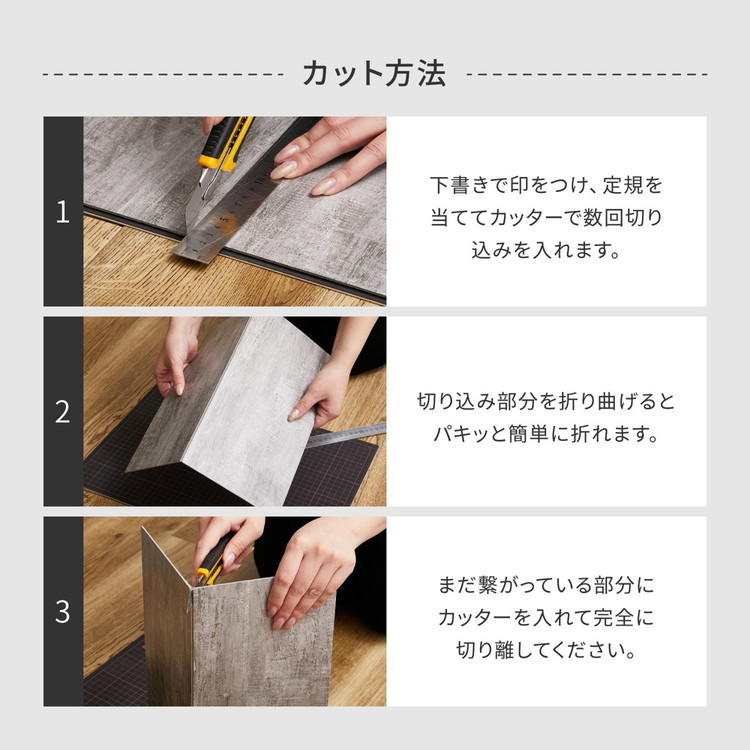 裏のフィルムをはがして床の上から貼るだけで簡単にフローリングのイメージを変えられます。原状復帰が必須の賃貸物件の模様替えや新築の汚れ防止など簡単にDIYできます。カッターで楽々カット。キッチンや洗面所など水周りにも使えて、粘着が落ちても水で洗えば繰り返し使えるモノトーンのフロアタイルです。