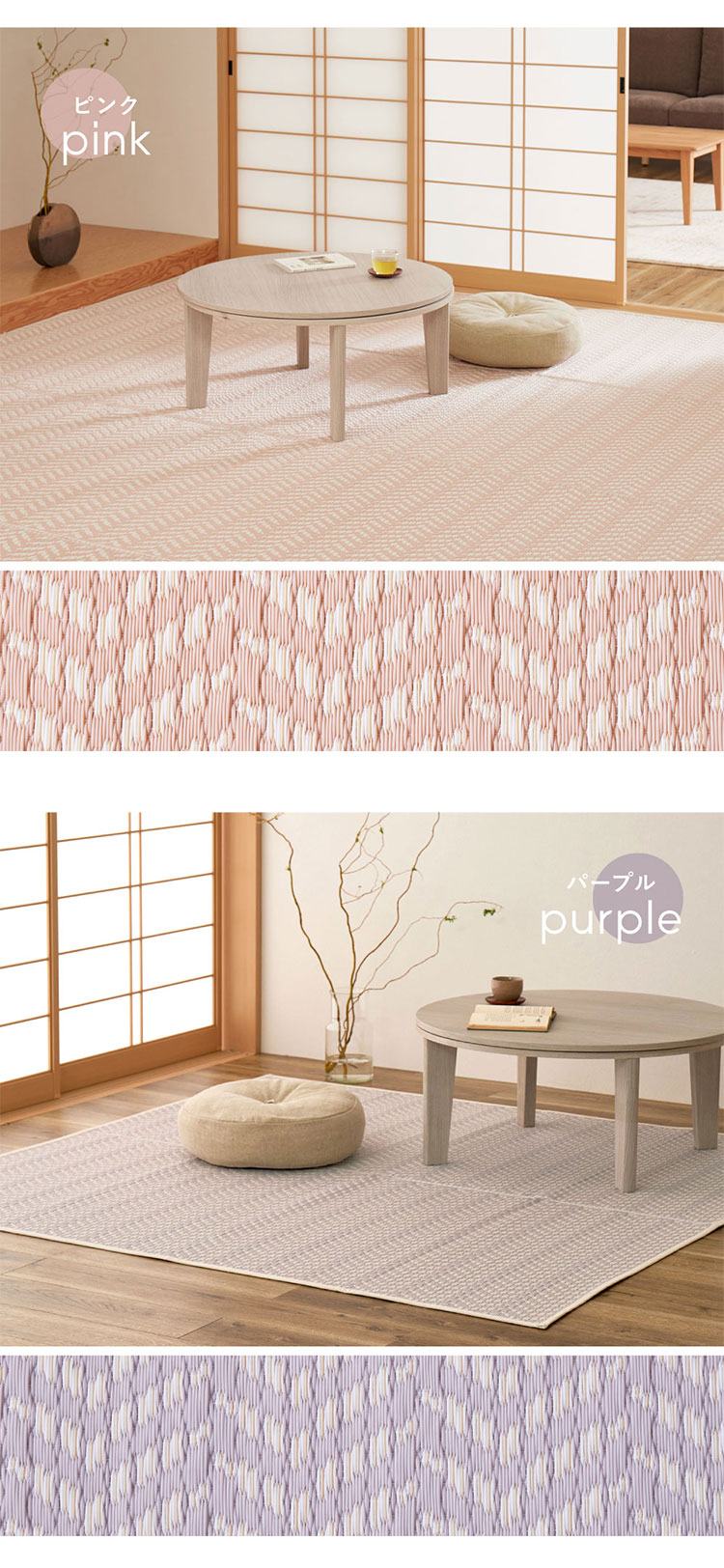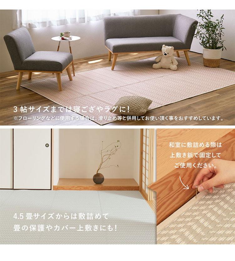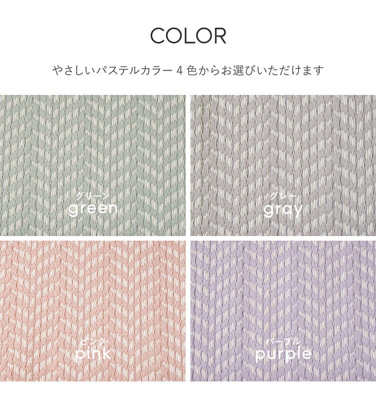 パステルカラーがかわいい、水拭きできる素材のい草風カーペット。パイプの表面に筋が入っている筋入りパイプで、肌に密着しないからベタベタしにくく、汗ばむ季節にもおすすめ。また、パイプ内の空気層の保温効果で床からの冷気を防ぐため、寒い季節でもあたたかく過ごせます。裏面は不織布貼りで、フローリングなど床への傷が心配な場所でも安心です。