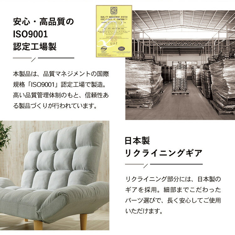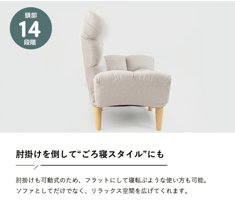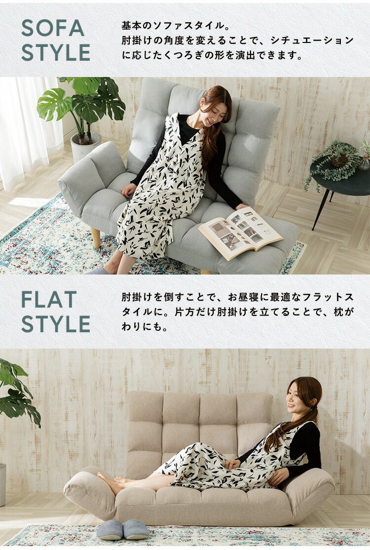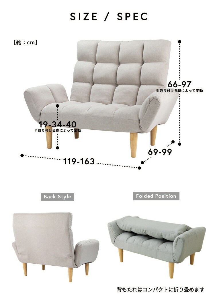 背もたれ部はスタンダードタイプの6段階リクライニングから7段階リクライニングギアにアップグレード(折り畳み可)。また今まで無かった肘部にも6段階のリクライニングギアを使用。様々な使い方が出来る便利なソファです。