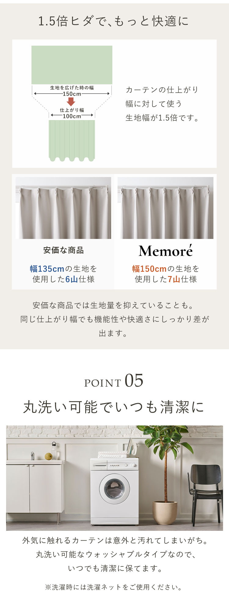 ご自宅の洗濯機で5回洗った後でも美しさが変わらない自慢のカーテンをお届けします。