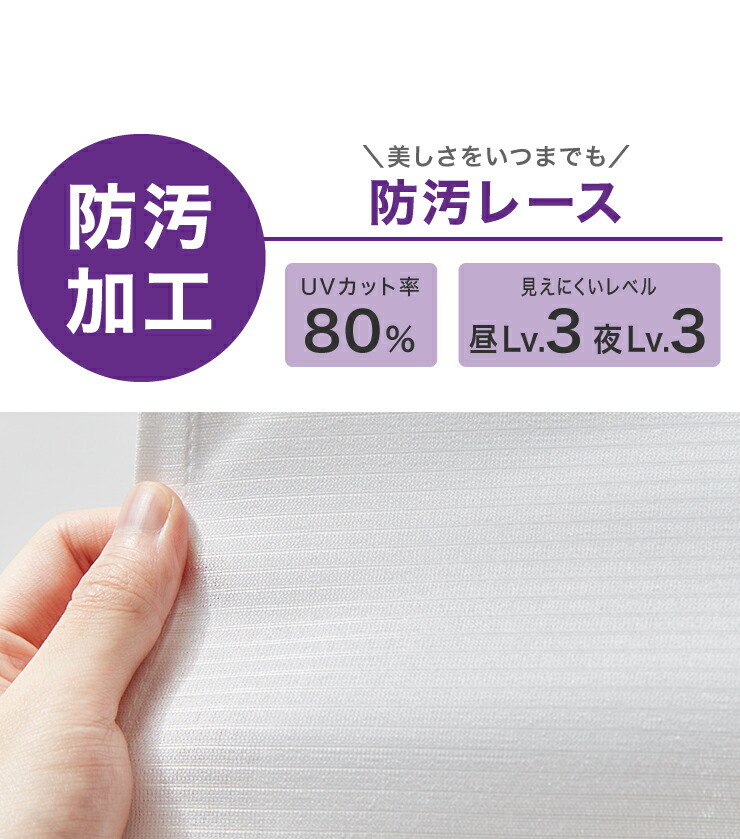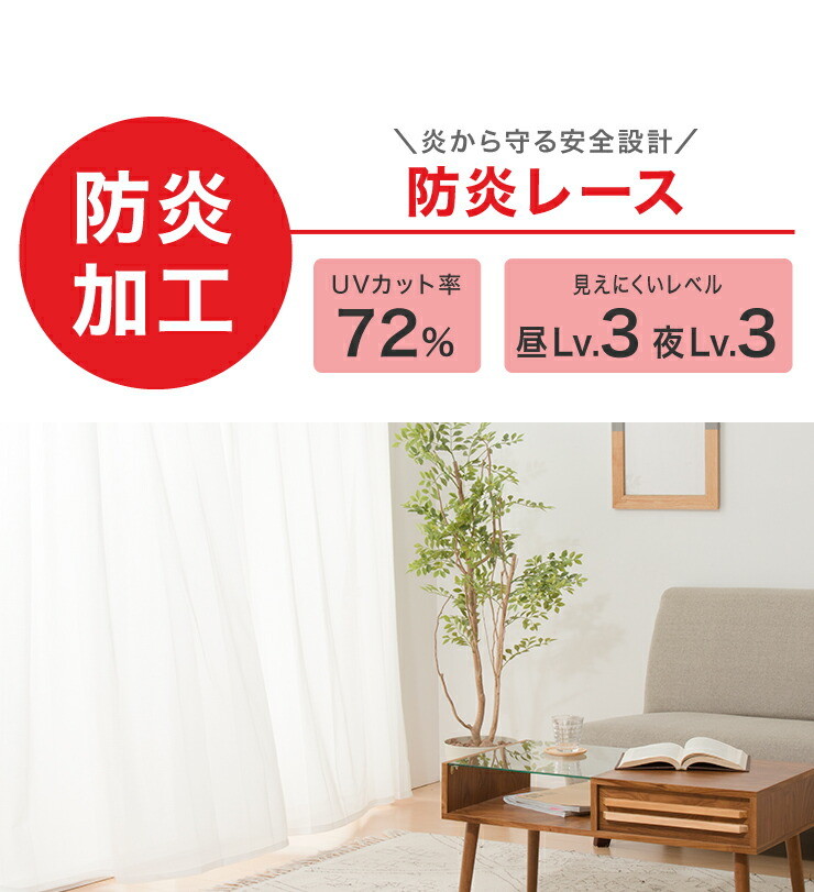 機能:防炎加工(防災ラベル付き)/UVカット率72%/見えにくいレベル昼3、夜3