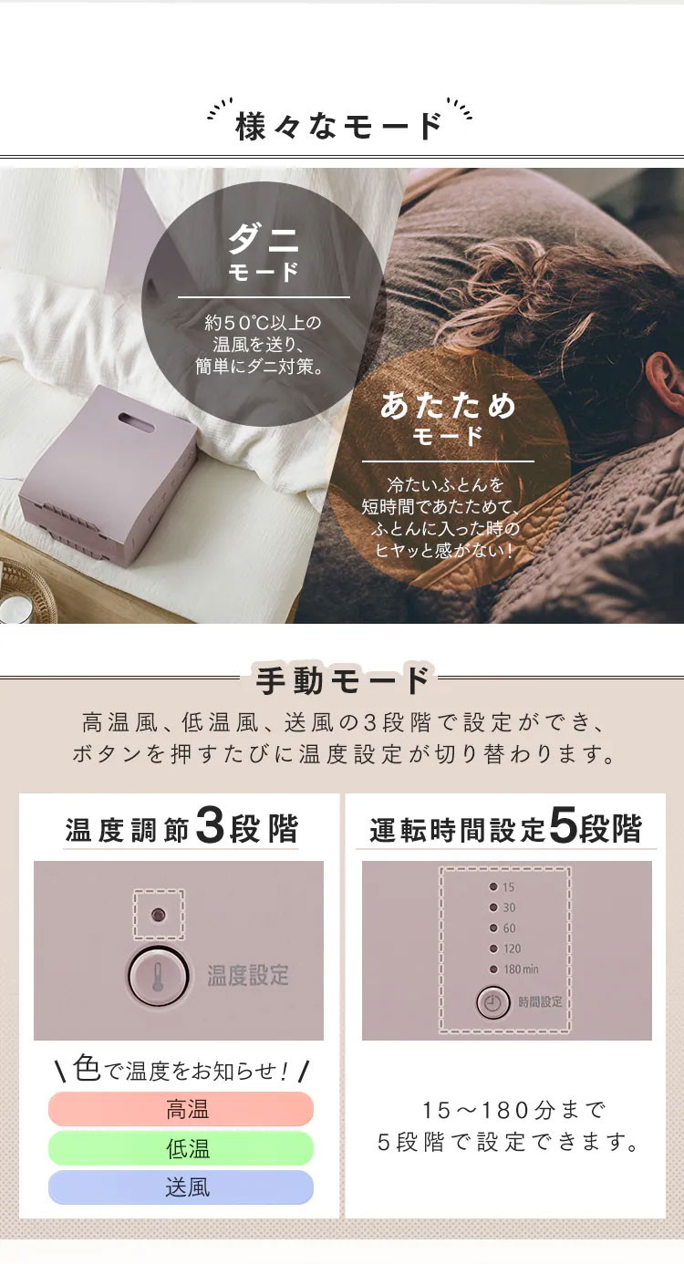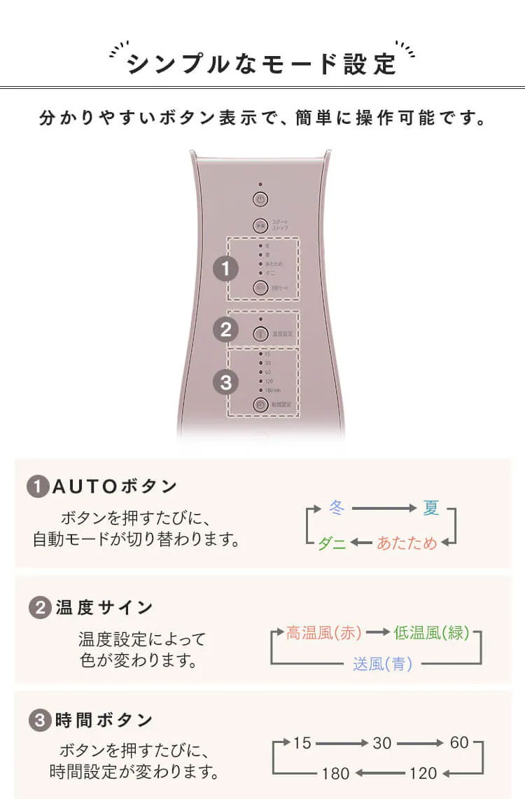 「ダニモード」「あたためモード」など便利な自動モード付き。