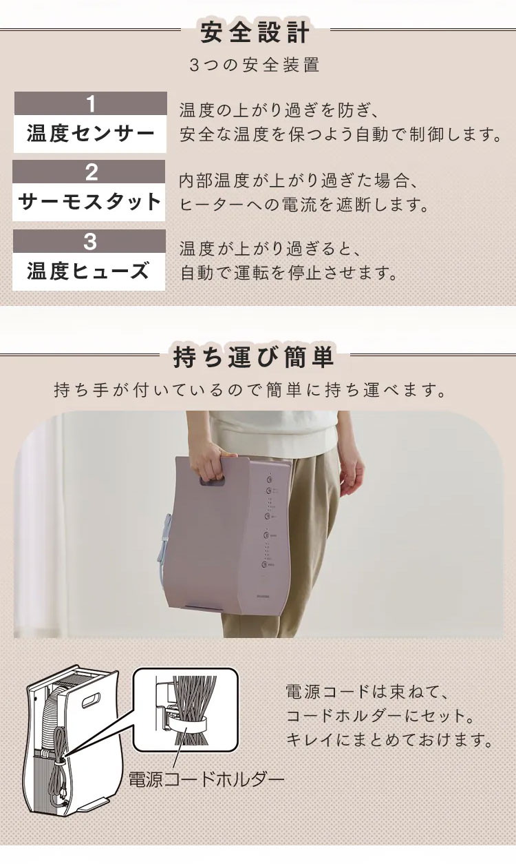 温度の上がり過ぎを防ぐ3種類の安全装置(温度センサー/サーモスタット/温度ヒューズ)を搭載。