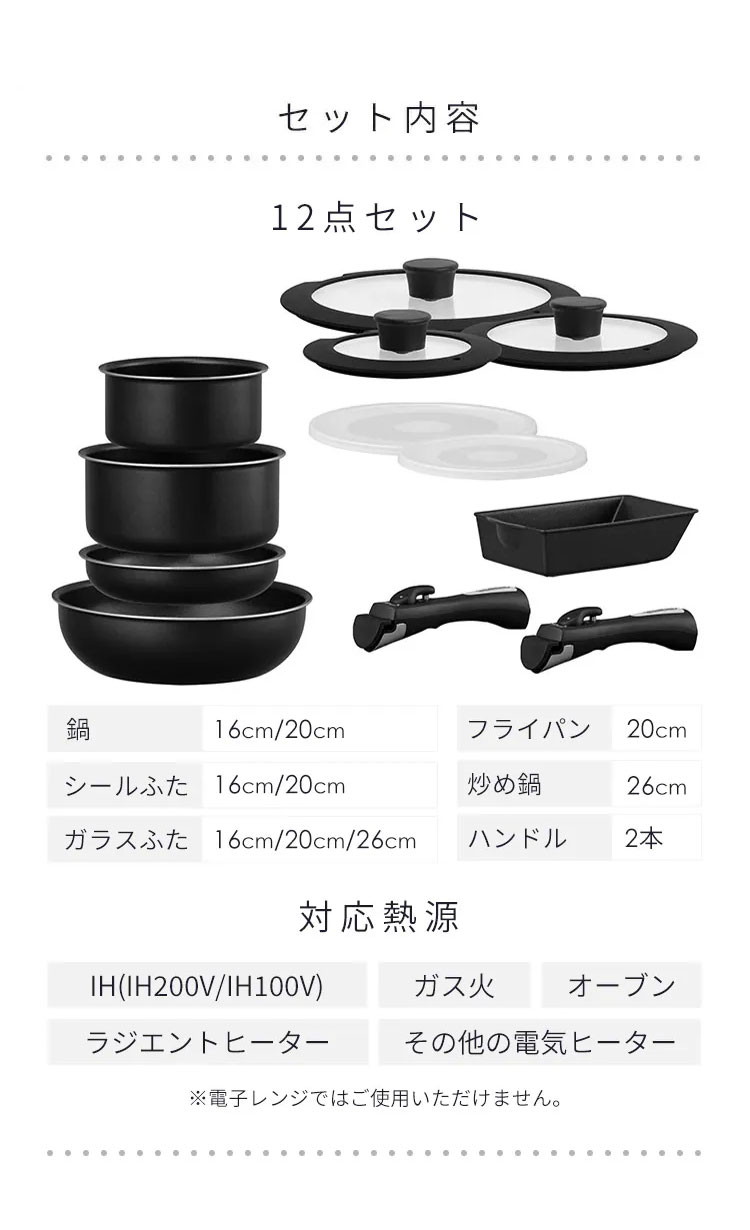 | 内容量 | フライパン20cm 炒めなべ26cm なべ16cm、20cm エッグパン(寸法:約20×14cm) マルチハンドル×2 ガラスふた16cm、20cm、26cm PEシールふた16cm、20cm |