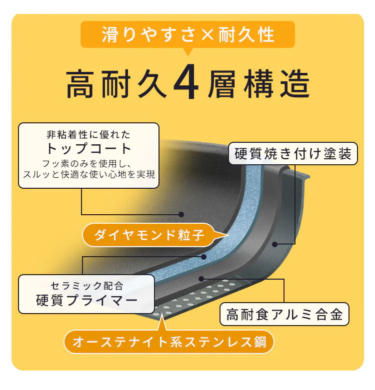 耐摩耗性を高めるダイヤモンド粒子をふっ素に配合したコーティングを使用しています。