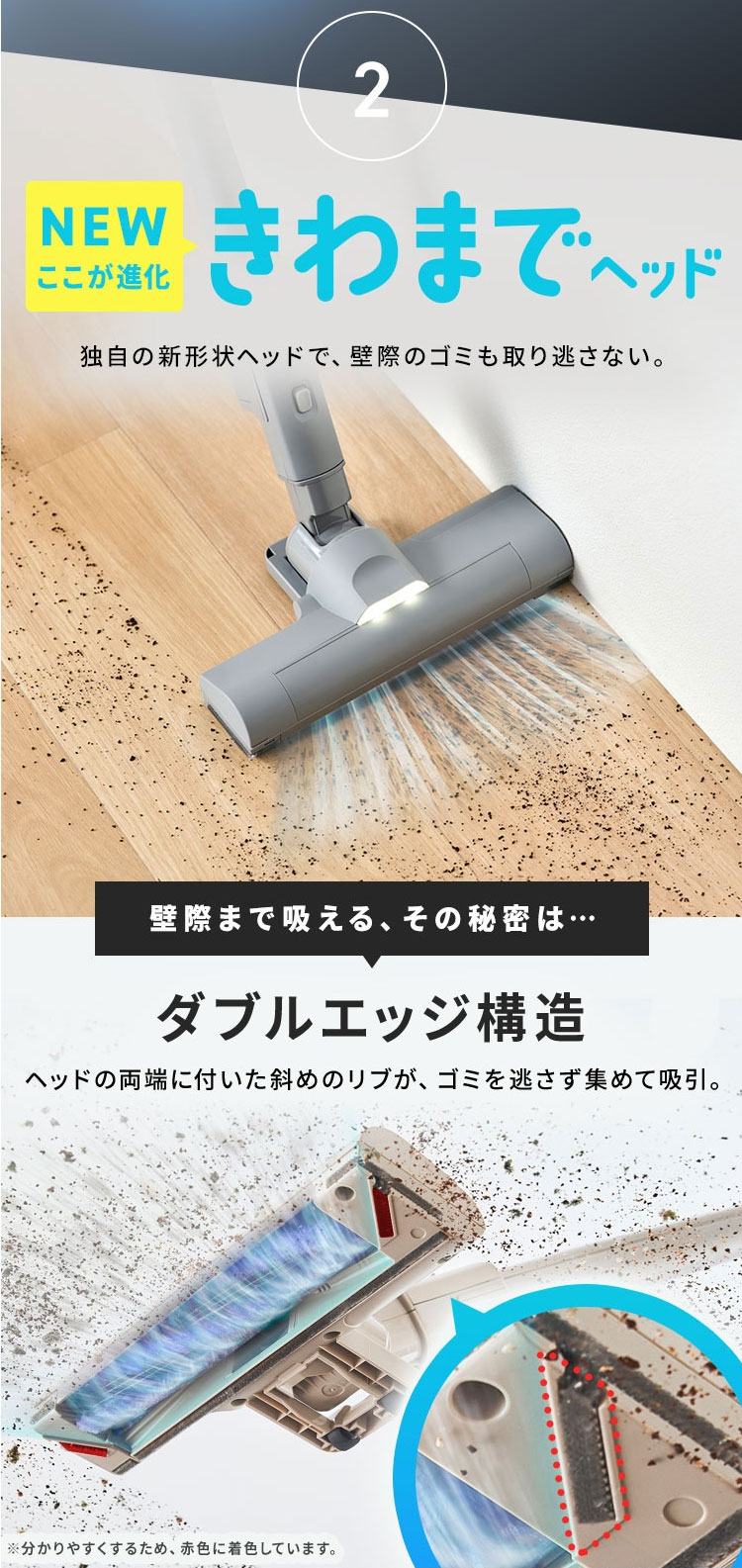 アイリスオーヤマ独自の新形状[きわまでヘッド]で、よりゴミを吸い逃しにくい構造です。