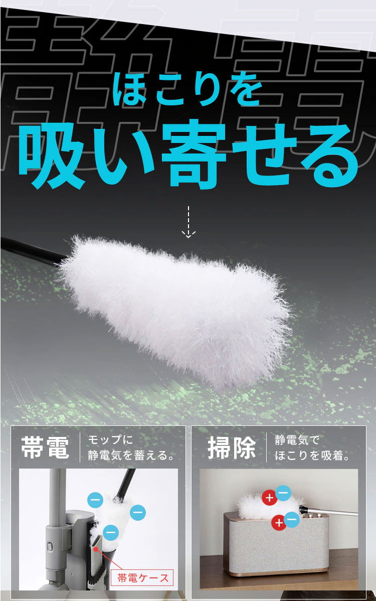 モップ帯電ケースで静電気を帯電させ、ホコリを吸着し、クリーナーで吸引するから何度も使えて経済的です。