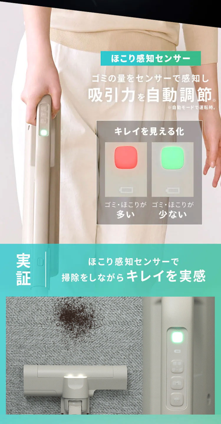・ホコリ感知センサー:ゴミの量をセンサーで感知して、キレイを見える化します。また自動モードで運転時、吸引力を自動調整します。