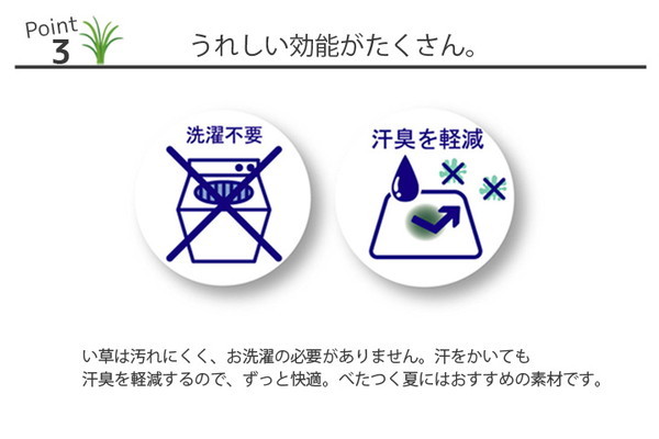 い草の表面に天然青森ヒバ加工を施しています(抗菌・防臭効果)。青森県のヒバの木から抽出した「ヒバ油」をメーカー独自の技術で材料や商品に加工しました。「ヒバ油」には、ヒノキチオールという天然物質としては極めて抗菌性の高い成分が含まれ、医療や食品など多分野で利用研究が進められています。