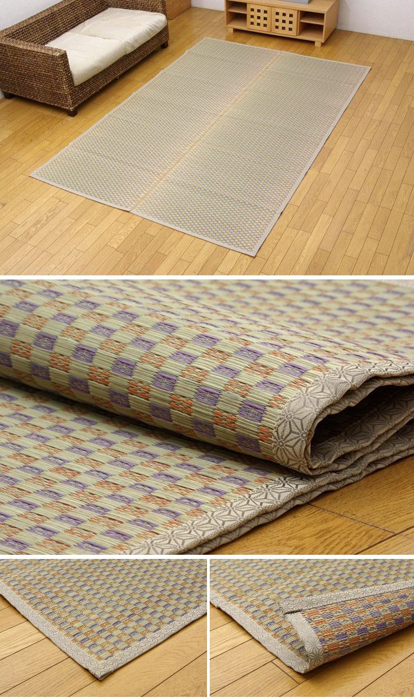 国産(九州産)い草を使用しています。一本一本が太く、表皮が厚く、繊維がキメ細かいので弾力性があり、耐久性に優れています。い草には空気の自然浄化作用、湿度の調節作用などがあります。また汚れにくく、使用するうちに黄金色に変化し味が出ます。い草に青森ヒバ加工を施しています。(抗菌、防臭効果)
