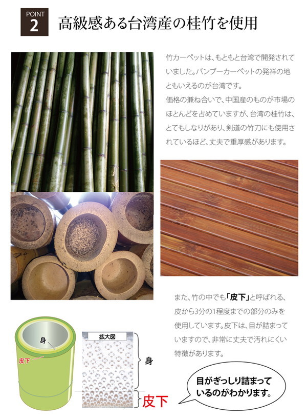 台湾の竹は丈夫で耐久性にすぐれており、竹本来の伝導率の良さでひんやりとした肌触りで夏も快適にご使用できます。竹は他の木材と比べると格段に成長が早く(3~5年で成竹)、持続的生産が可能な環境に優しいサスティナブルな素材です。
