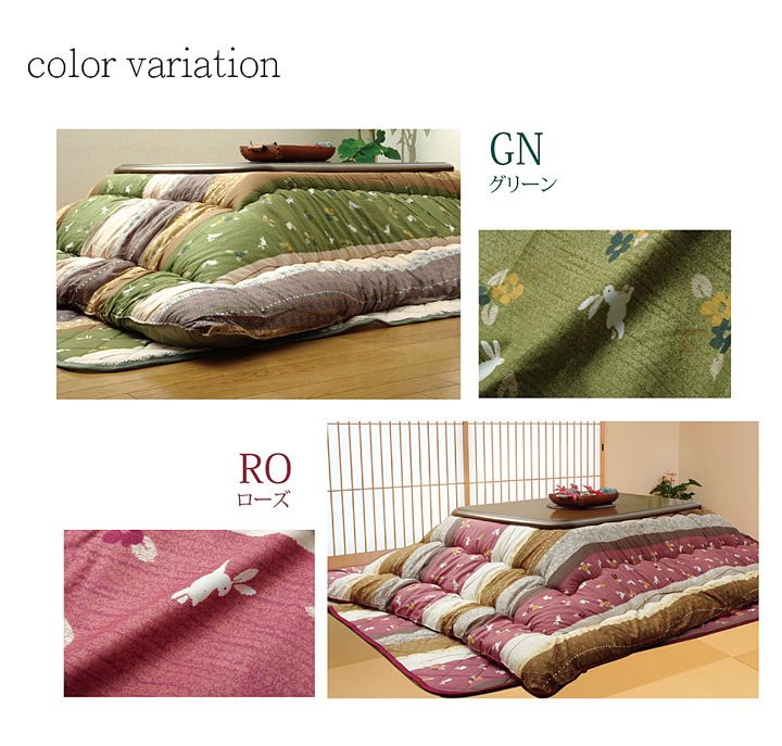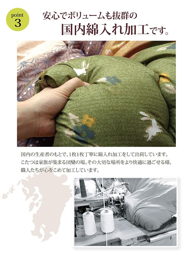 和調のウサギ柄こたつ布団です。こちらの商品は国内でわた入れをしています。側地にはポリエステル素材を起毛させた柔らかい生地を使用しています。部分暖房のこたつは電気代もおトクです。