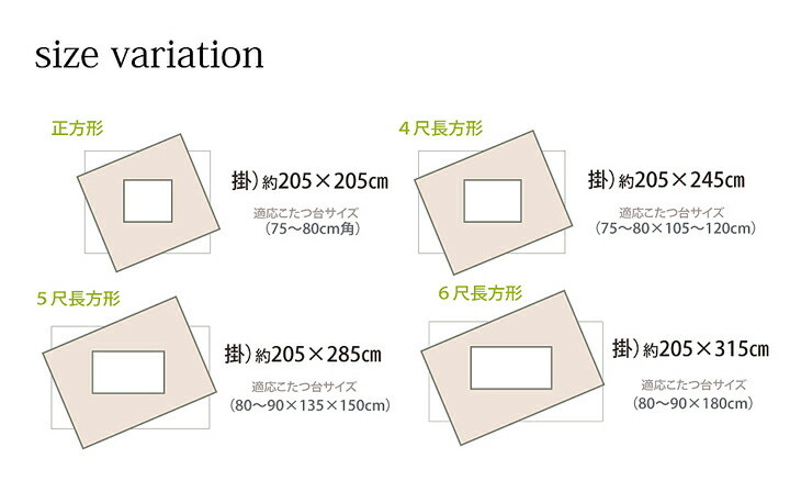 約205×285cm(80~90×135×150cm幅のこたつ台に適応)