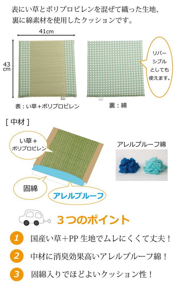 表地には国産のイ草を使用しています。い草には空気の自然浄化(消臭)作用、湿度の調節作用などがあり、長時間座った際のムレを軽減します。表地と中わたの間にダイワボウノイ株式会社のアレルプルーフを入れております。アレルプルーフの特長として・アレル物質を吸着、ダニの死骸や糞・花粉等のアレル物質を繊維上で吸着します・抗菌防臭、繊維上の黄色ブドウ球菌の増殖を抑制します、などがあります。中材には固わたを使用、ヘタリにくく適度なクッション性があります。ご家庭のクッションとしてもご使用頂けます。