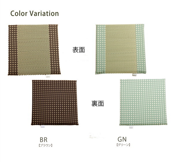 表はイ草とポリプロピレン、裏は綿生地のリバーシブルタイプのカークッションです。
