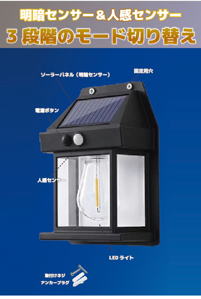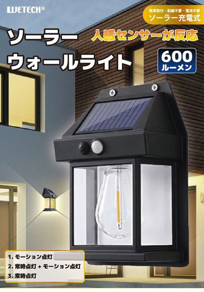ソーラーウォールライト 人感センサー ソーラー充電式 配線不要 電池不要 簡単取り付け ウォールライト 壁かけ照明
