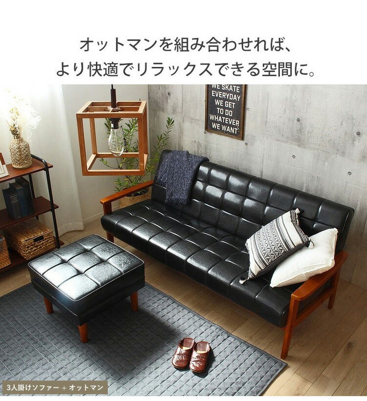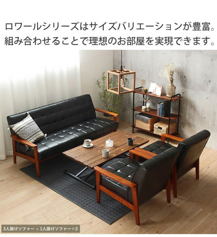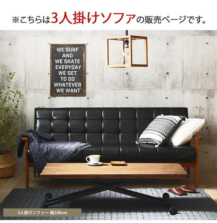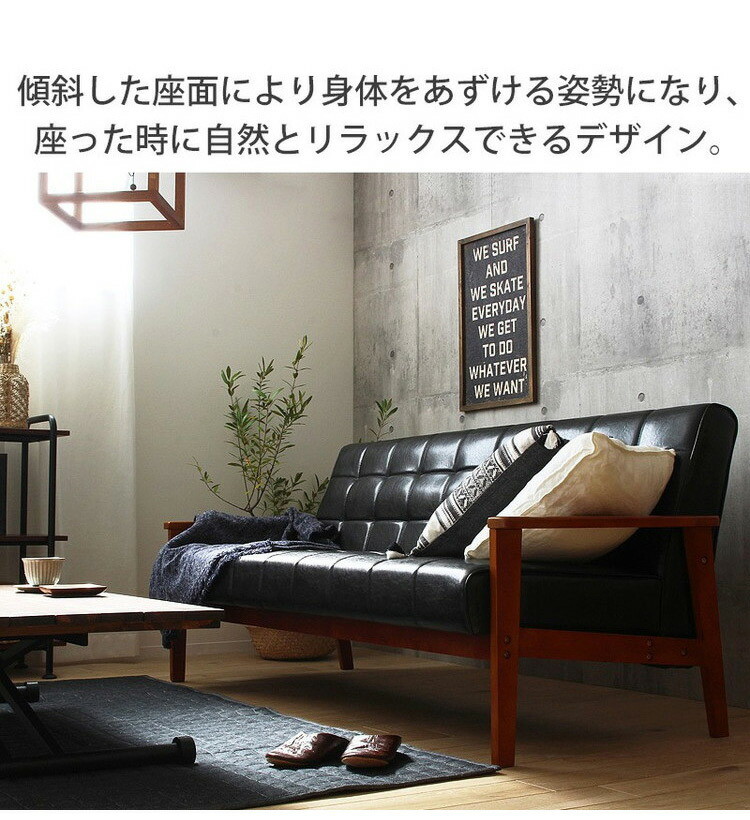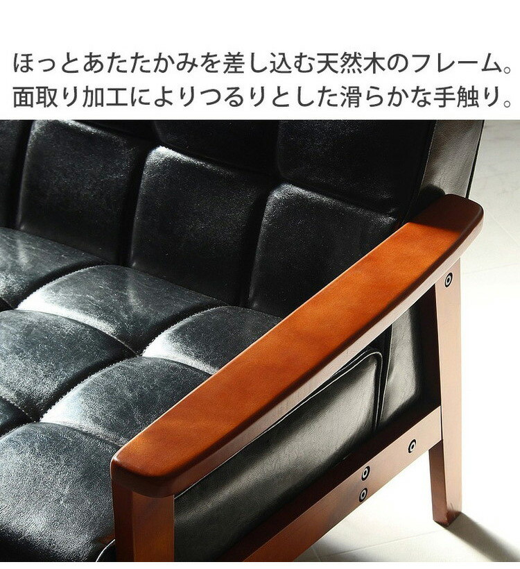 ソファ 3人掛け 幅180cm Loire ロワール レトロモダンデザインソファ 木肘 ブラック レザー ソファー