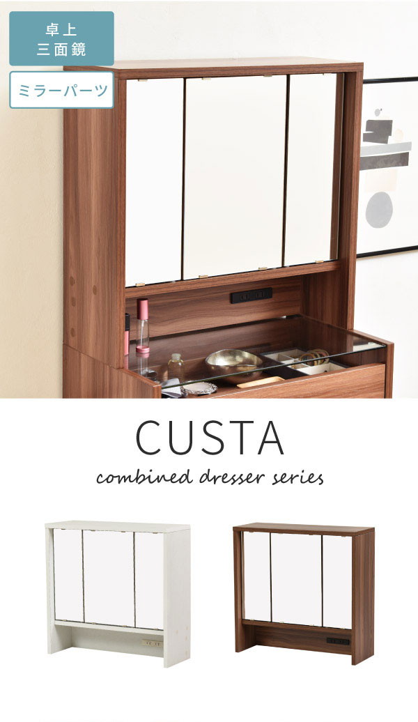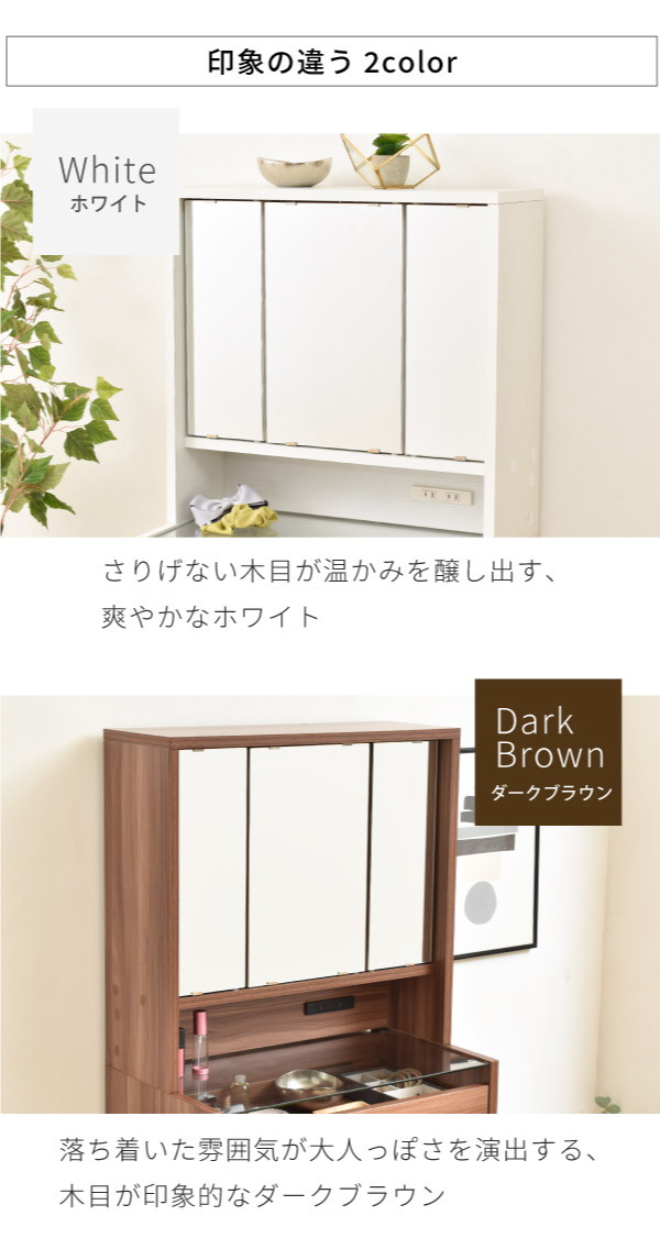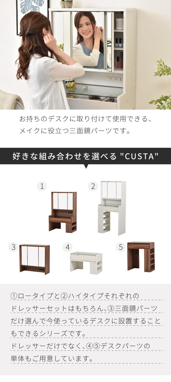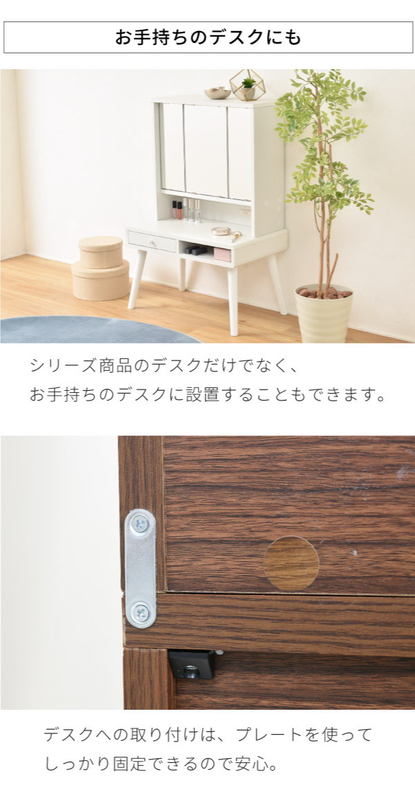 お手持ちのデスクに取り付けて使えるドレッサーパーツ。メイクやヘアアレンジの際に役立つ三面鏡タイプです。