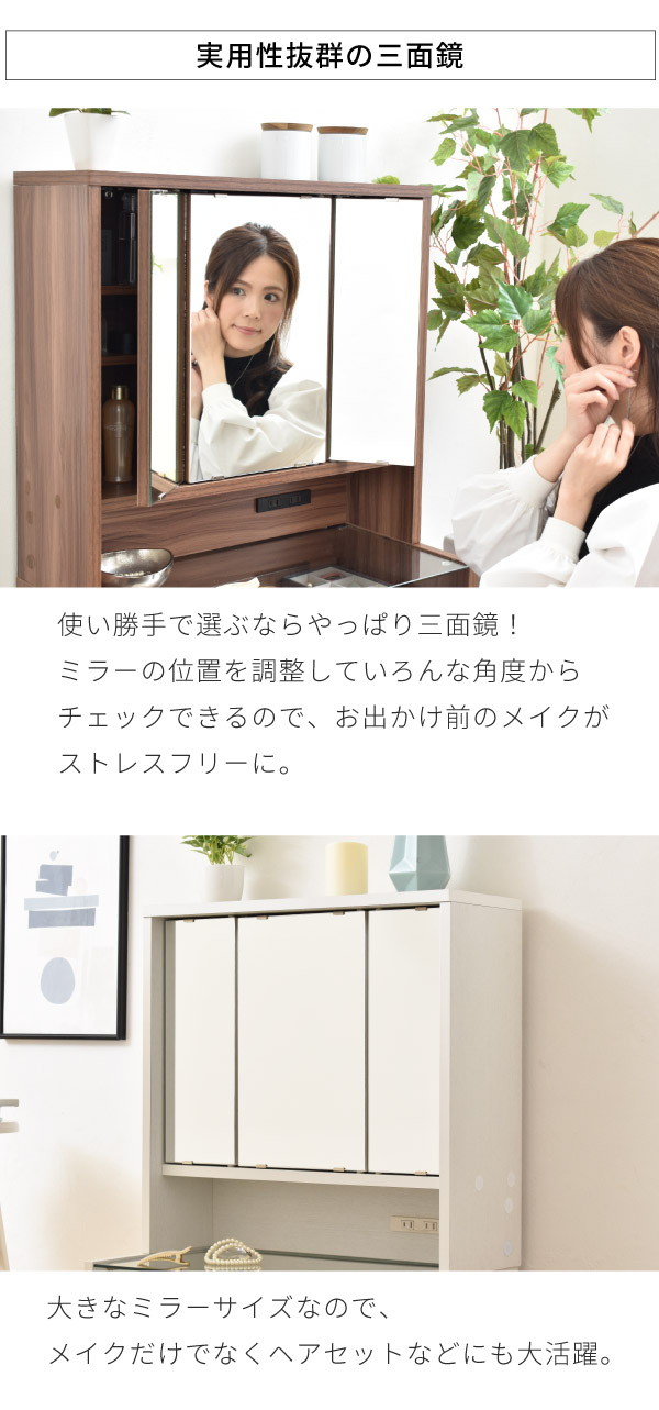 卓上ミラー 三面鏡 幅60 収納付き 大容量 卓上ドレッサー 卓上三面鏡 ドレッサー 鏡のみ 収納付き 木製 大型 ブラウン