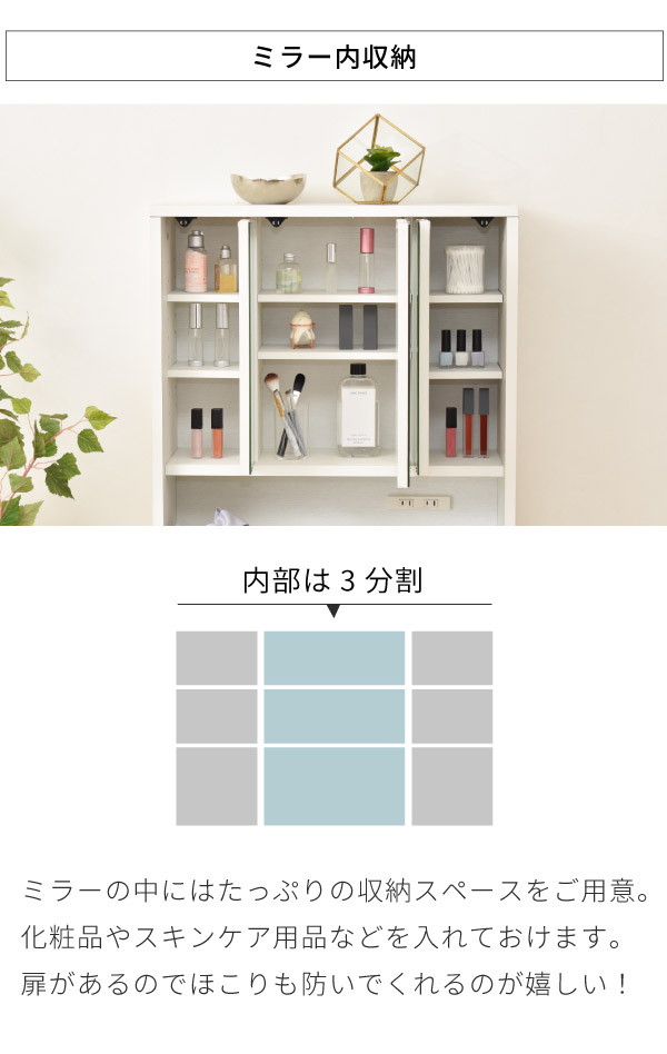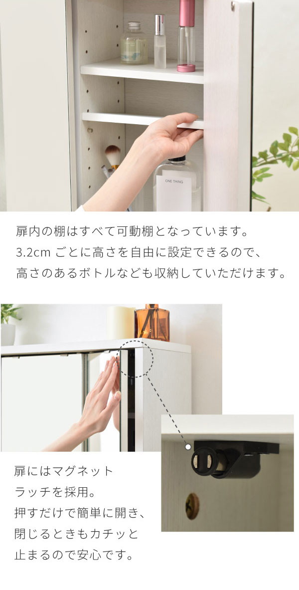 ミラーの中には高さを調節できる棚がついているので、メイクグッズやボトル、スプレーなどもまとめて収納できます。