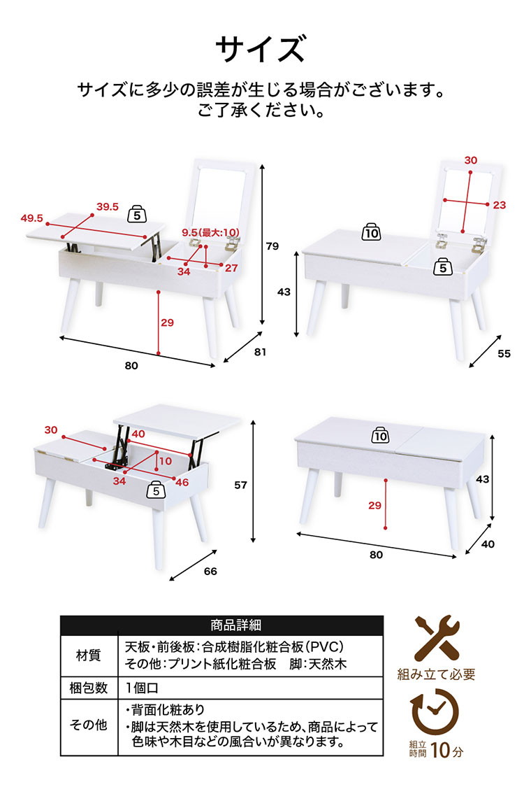 リフティングテーブル ドレッサー 昇降式 半完成品 デスクドレッサー コンパクト 収納 女優ドレッサー