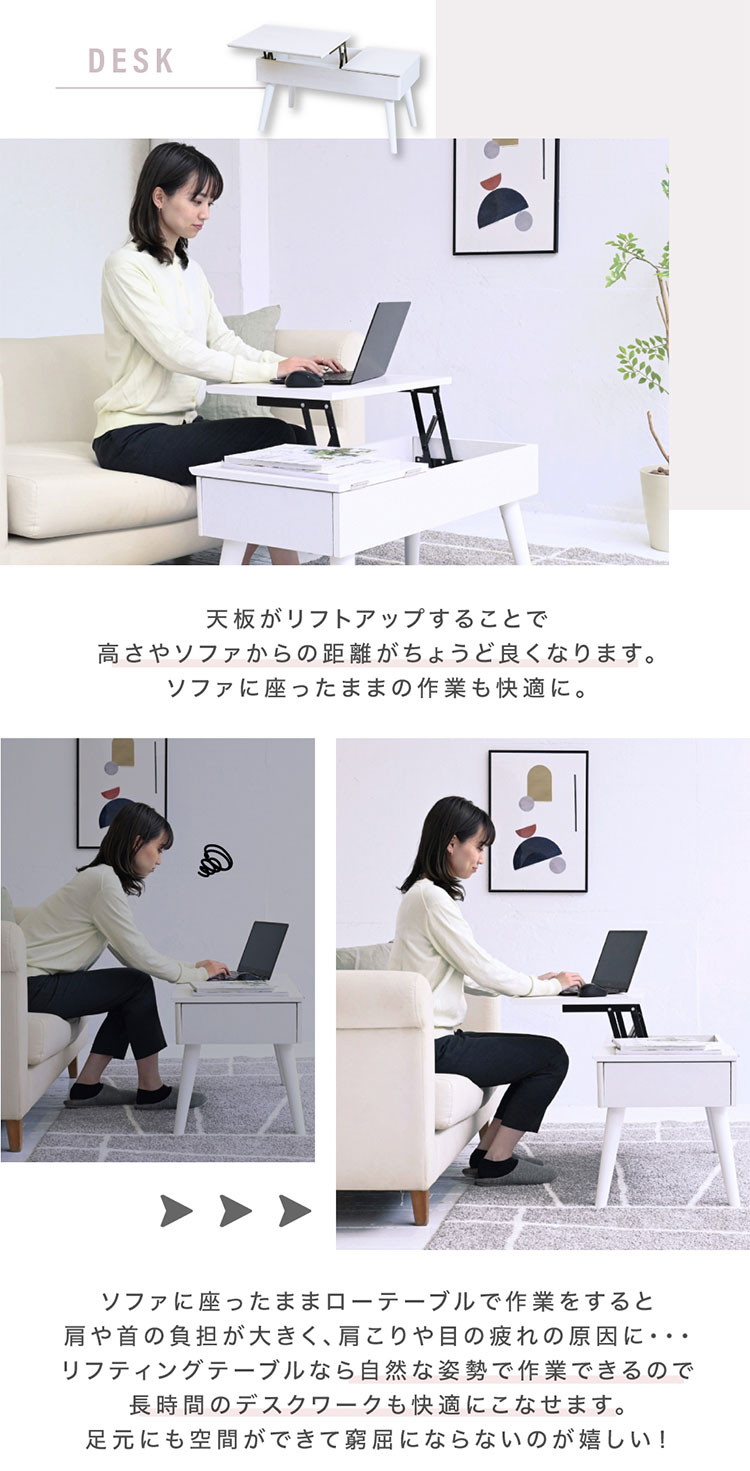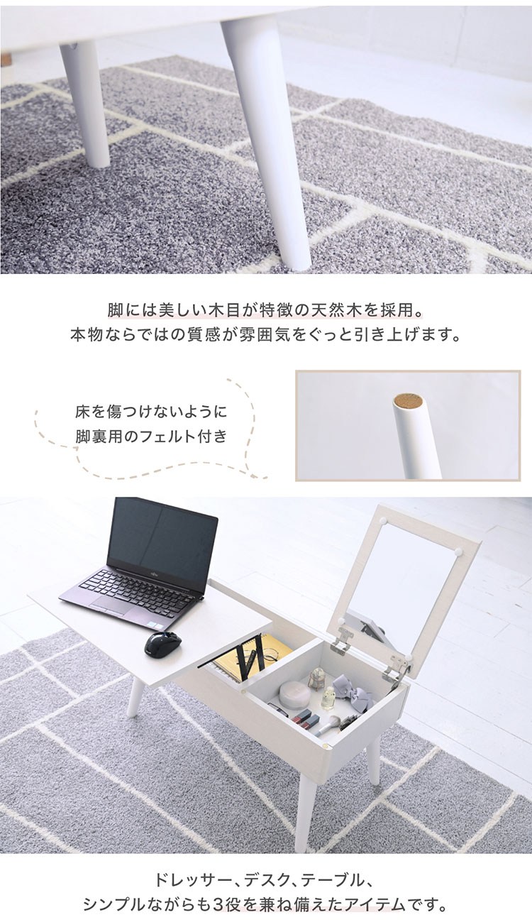 限られたスペースだけどテーブルもドレッサーもデスクも置きたい…という想いを叶えてくれる、1台3役のリフティングドレッサーテーブル!右側を開けばドレッサーに、左側を開ければデスクに早変わり。普段はリビングテーブルとしてお使いいただける多機能なアイテムです。