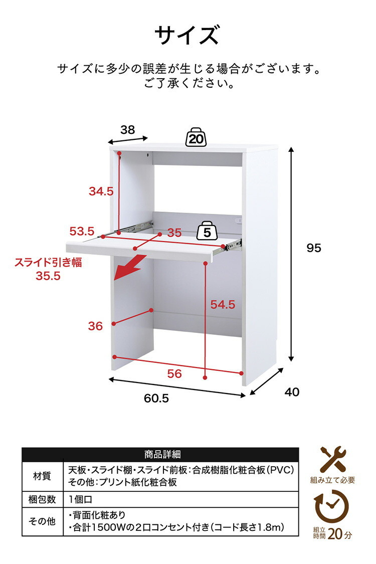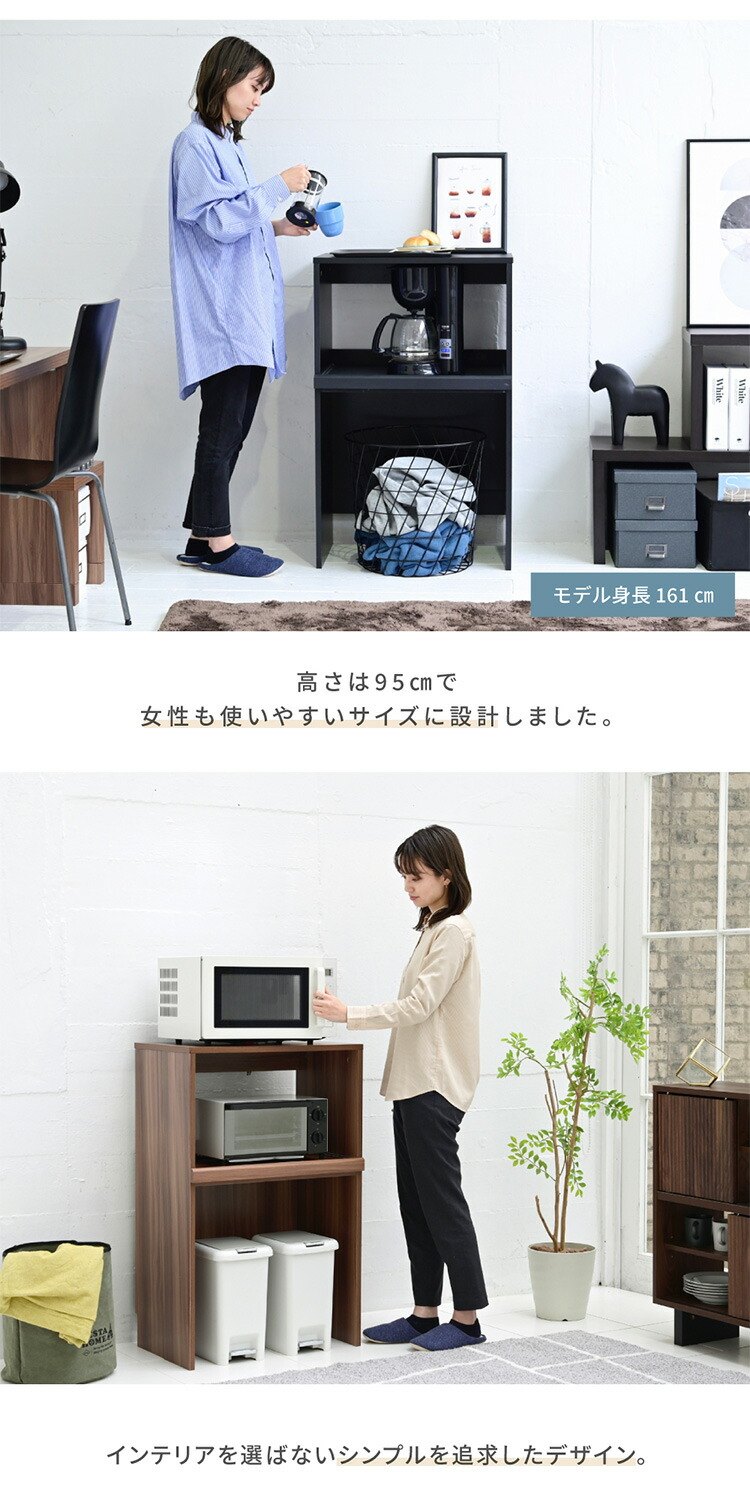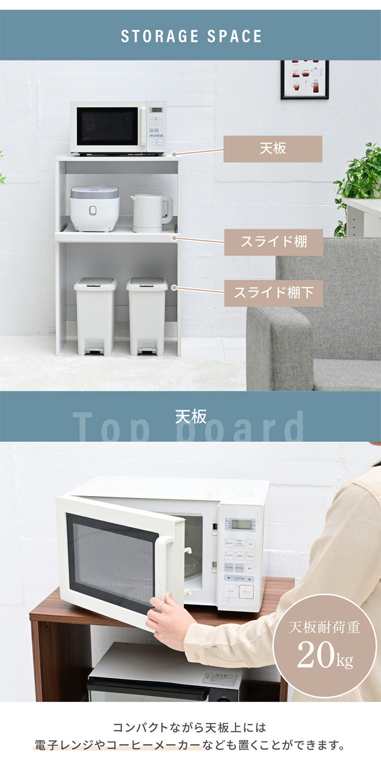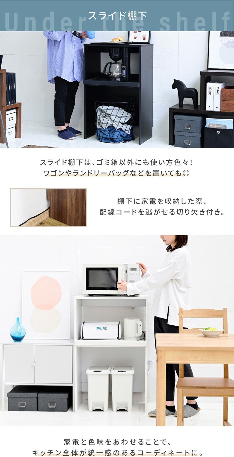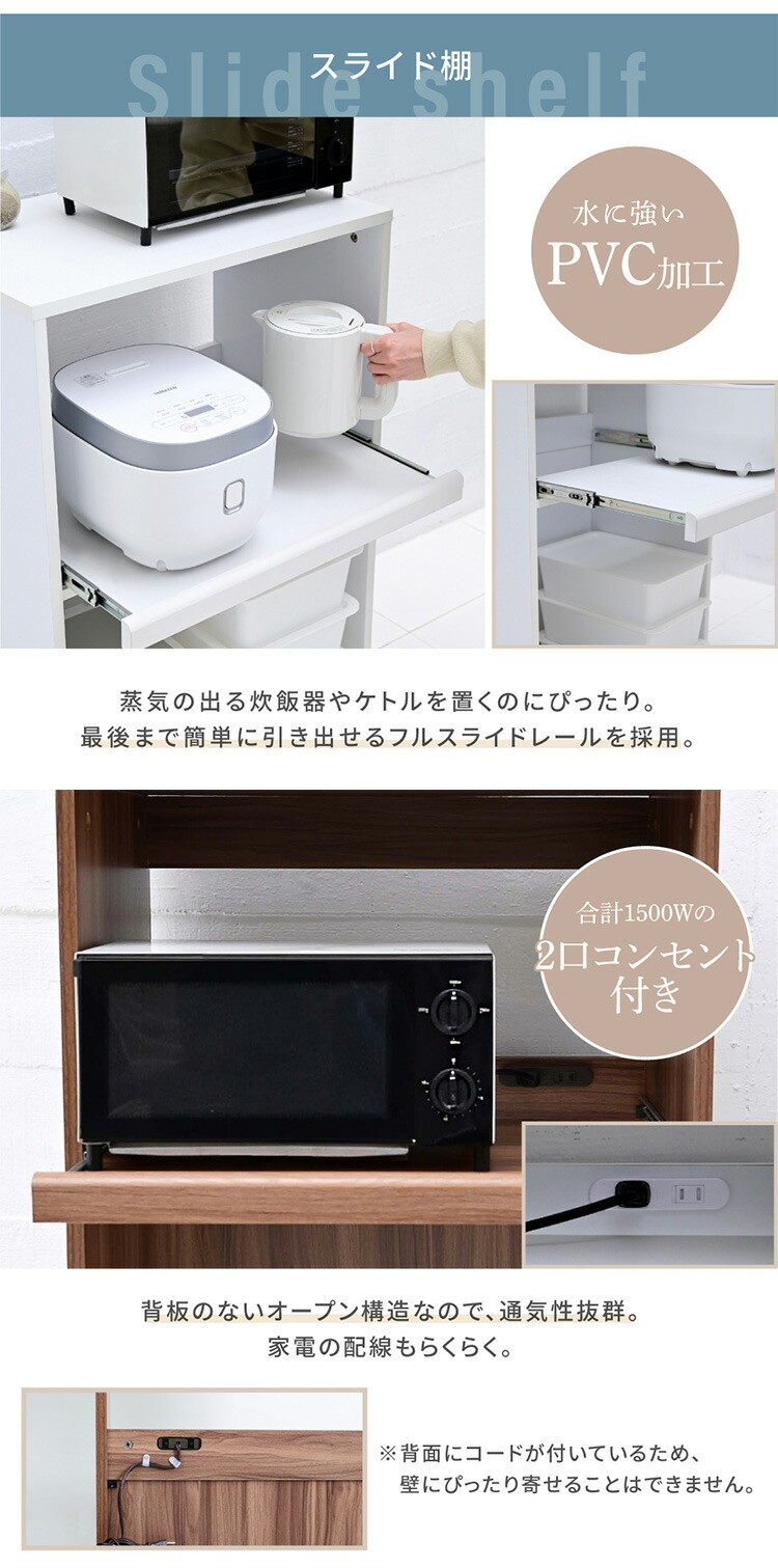 天板にはレンジを置くことができる他、コンセント付きのスライド棚は炊飯器やケトルなどの家電を収納するのにぴったり。
