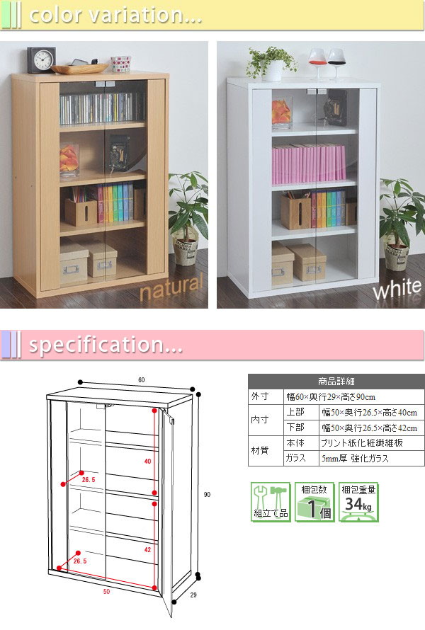 [内寸](上部)幅50×奥行26.5×高さ40cm(下部)幅50×奥行26.5×高さ42cm(可動棚)幅56×奥行24×厚み1.8cm(3.2cmピッチ6穴)
