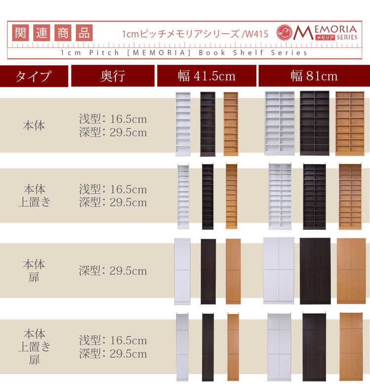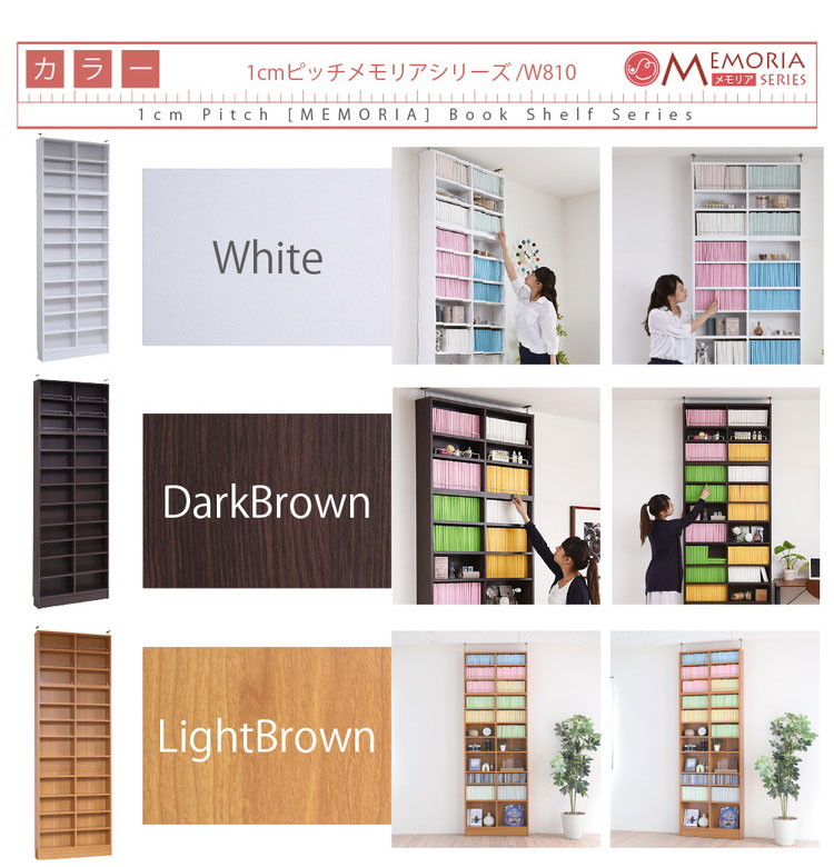 突っ張り上置きセットなので天井まで空間の無駄を省いて大量収納。1cm間隔で棚板が設置でき、固定棚の無い画期的な仕様により、従来よりも自在な棚割りを可能にしました。ラックの中にデッドスペースを作らず、より多くの物が収納できます。薄型だからリビングだけでなく廊下や、狭いスぺースでも収納を確保できます。シリーズで揃えればまるで図書館 。ミドルなサイズの薄型幅81はリビングにぴったり