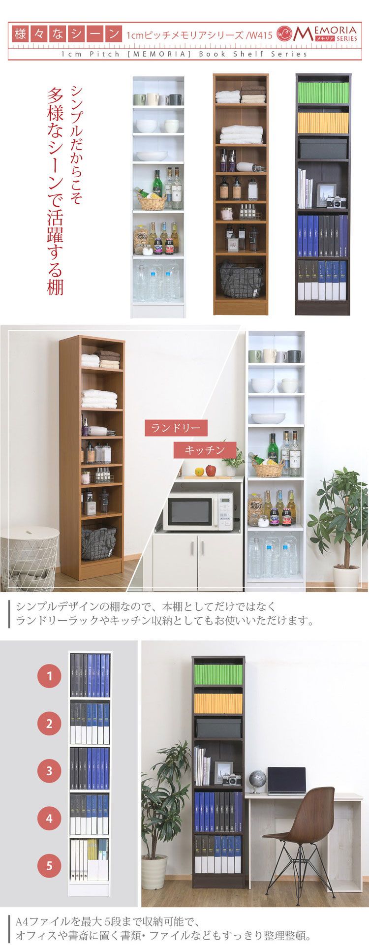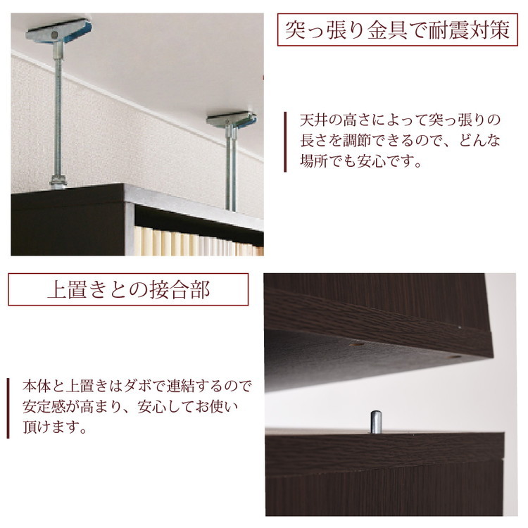 突っ張り上置きセットなので天井まで空間の無駄を省いて大量収納。1cm間隔で棚板が設置でき、固定棚の無い画期的な仕様により、従来よりも自在な棚割りを可能にしました。ラックの中にデッドスペースを作らず、より多くの物が収納できます。深型だから、文庫本や大きな辞書はもちろん、本だけでなく雑貨まで収納。スリムなサイズの深型幅41.5はリビングにも、プライベートルームにも。