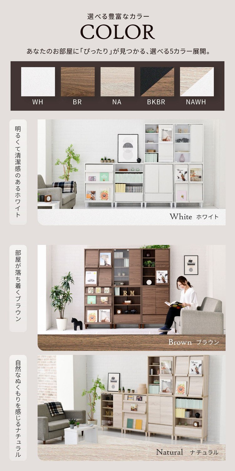 スライド扉&オープンキャビネット。6つのデザインと5つのカラーからお選びいただける6デザインキャビネット”Adatto”。引き違い扉にディスプレイ、扉の位置で見せる部分と見せない部分を使い分け。