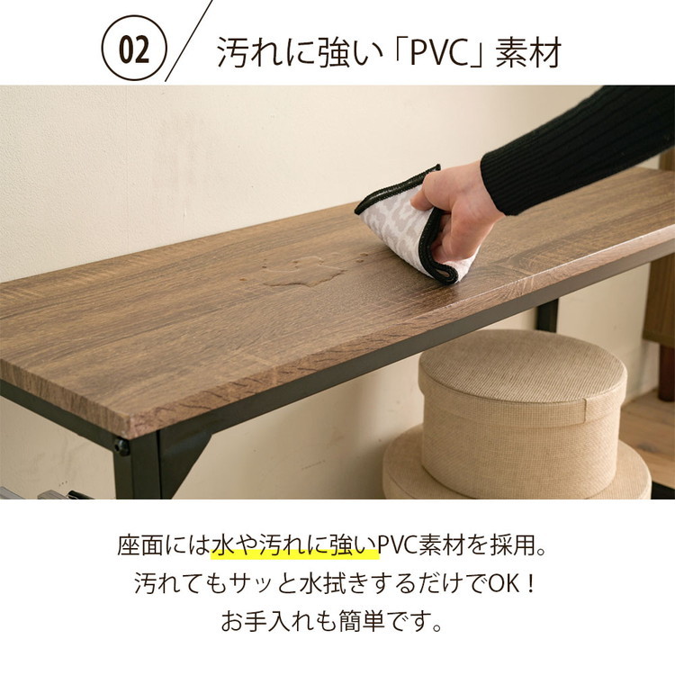ダイニングやエントランスのベンチなどに使え、ディスプレイ台としても使える優れもの。座面下にはオープンスペースがあるのでラック下収納部としても使えます。座面はPVCなので傷や水分に強く、小さな花瓶などのディスプレイにも◎