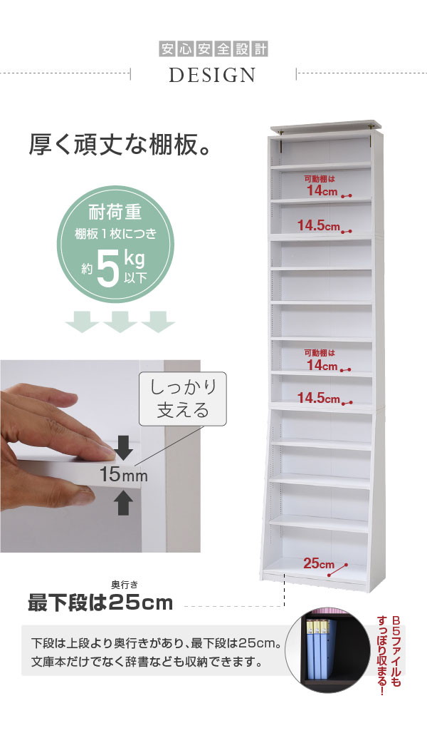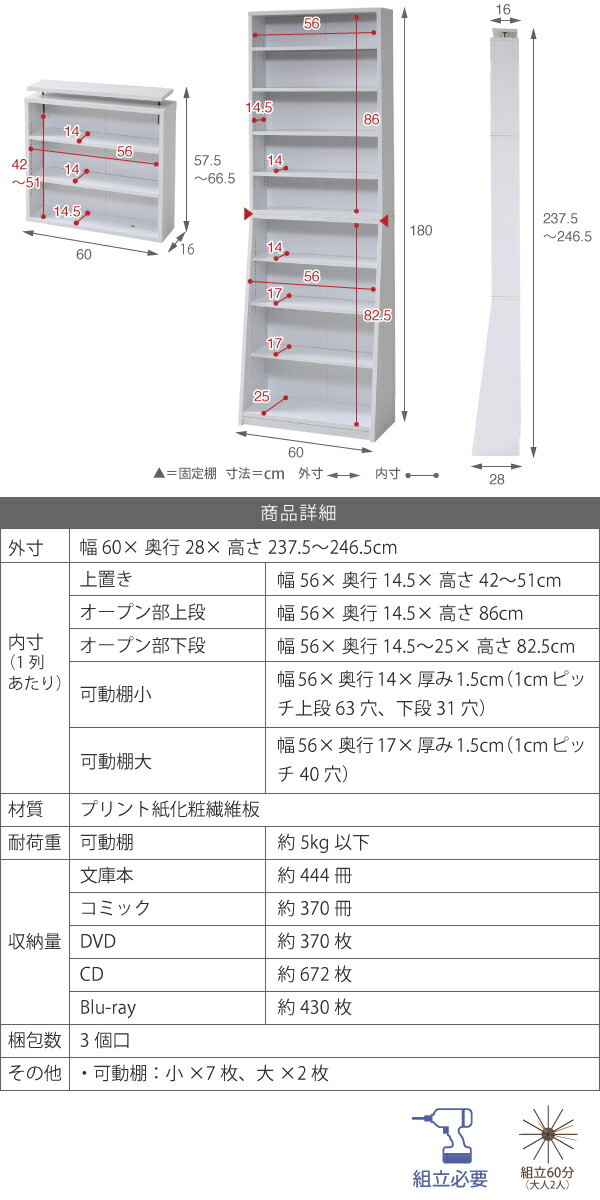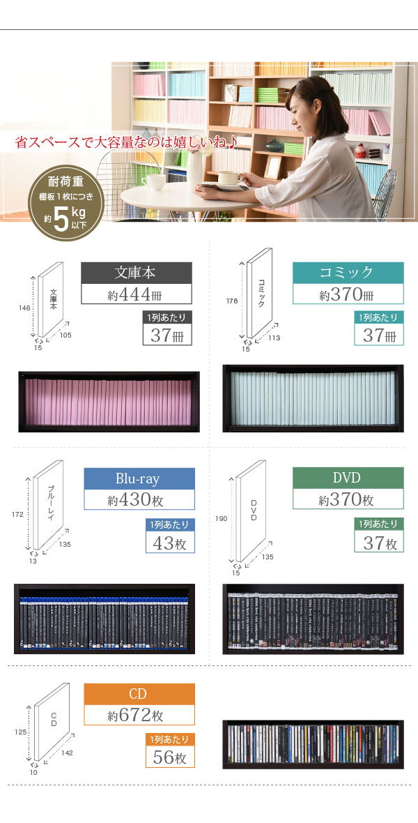 [収納量](文庫本)約444冊、(コミック)約370冊、(DVD)約370枚、(CD)約672枚、(Blu-ray)約430枚