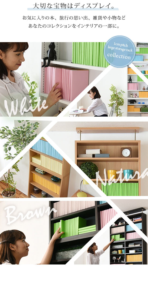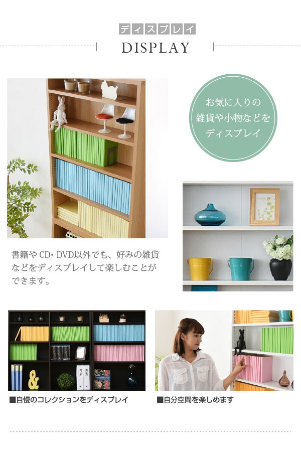 棚板を1cm間隔で調整できるので、本だけでなく、ディスプレイラックとして使える万能本棚。
