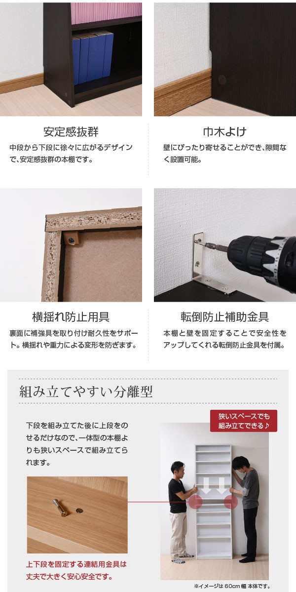 1cmピッチ 薄型 大容量 文庫本ラック 幅60 上置きセット 書棚 壁面収納 つっぱり 木製 本収納 漫画 CD ダークブラウン