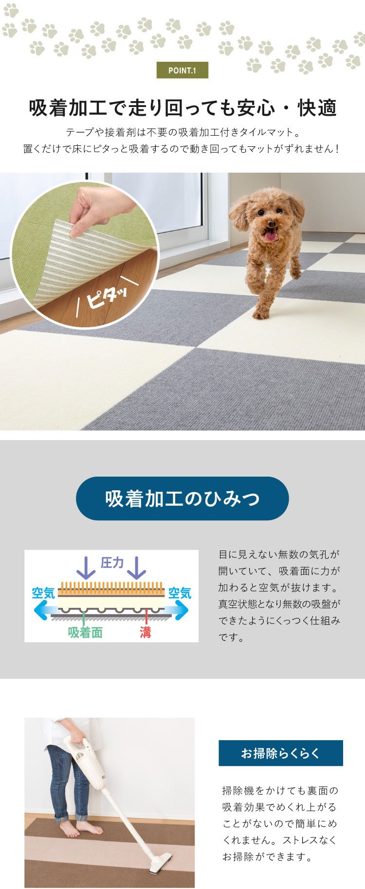 ・掃除機をかけても、裏面の吸着効果でめくれ上がることがないので、お掃除もラクラク!