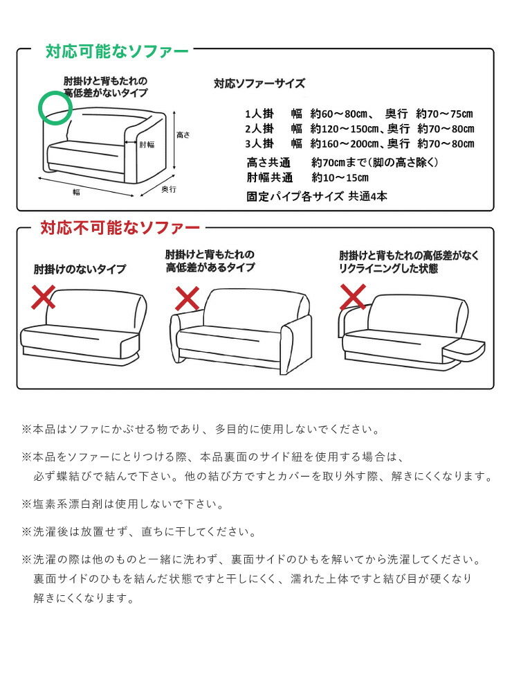 | サイズ/寸法 | 1人掛け用 (約)幅60~80、奥行70~75、 高さ70cmまで(脚の高さ除く) 肘幅10~15cm |