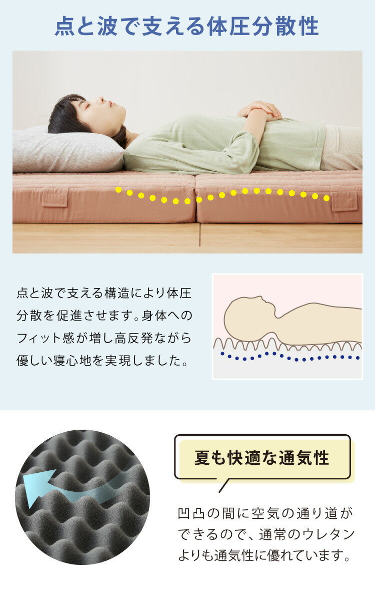 ウレタン表面にはプロファイル加工を施し、身体を点で支え、体圧分散性を高めております。