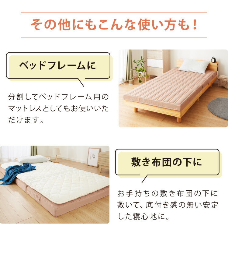ご使用時は、マットレス同士を面ファスナーで連結。収納時は、連結を外してそれぞれ収納できる三つ折りタイプ。コンパクトな圧縮梱包にてお客様へお届け致します。