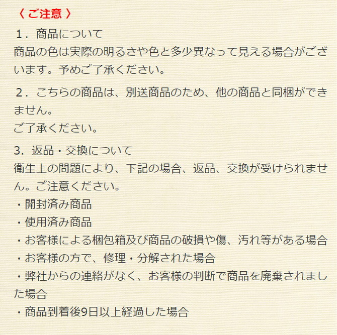 ・サイズのイメージ違い(「思ったよりも大きかった、小さかった」等。サイズは商品ページに記載してあります。