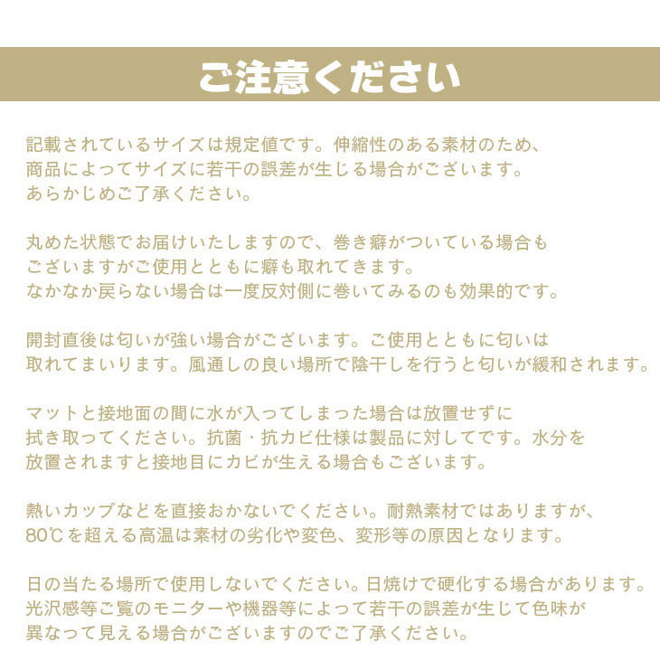 ・熱いカップ等を直接おかないでください。耐熱素材ではございますが、80℃を超える高温は素材の劣化や変色、変形等の原因となります。