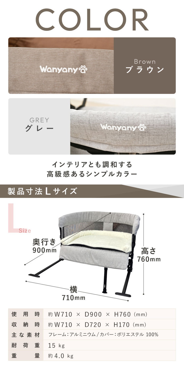 wanyanya ペットと添い寝できる ベッド Lサイズ 添い寝ベッド 取り付け簡単 洗える 折りたたみ ペット用 犬 猫 GUUUSLEEP グレー