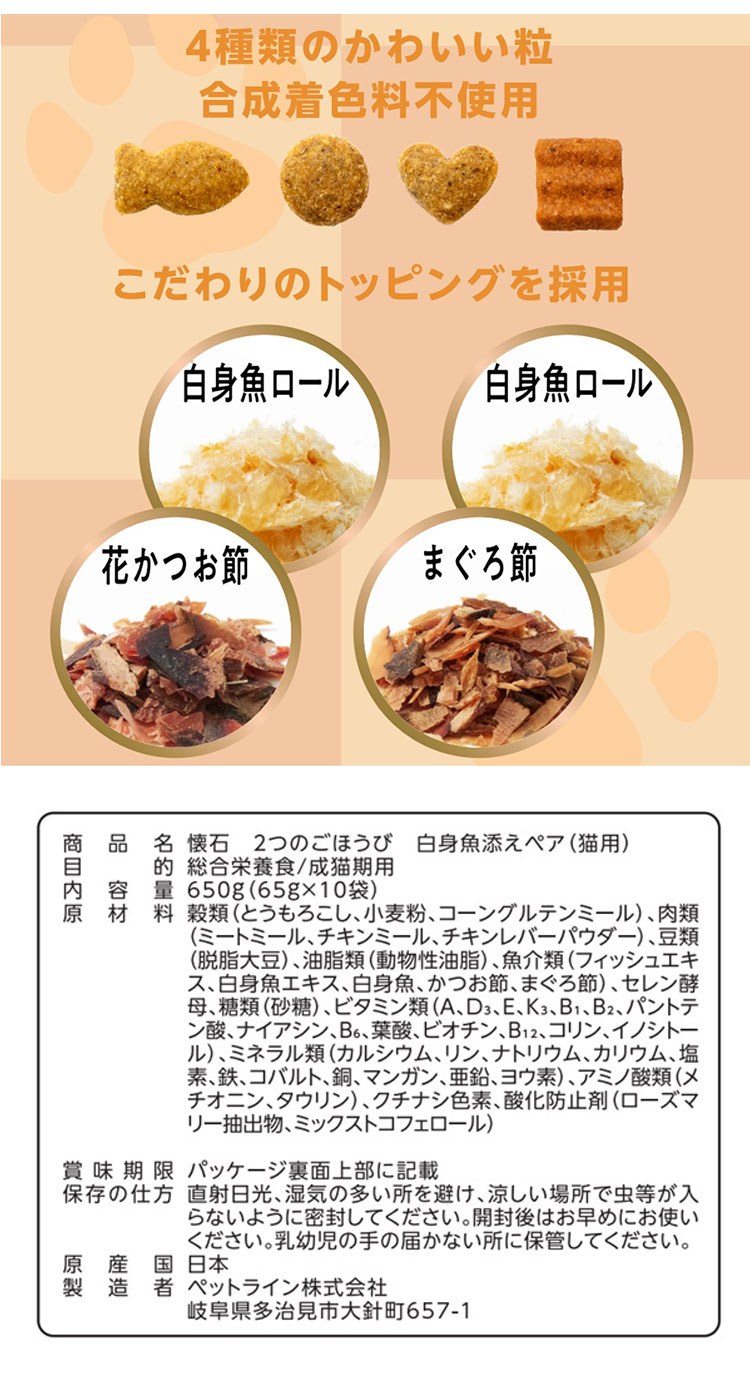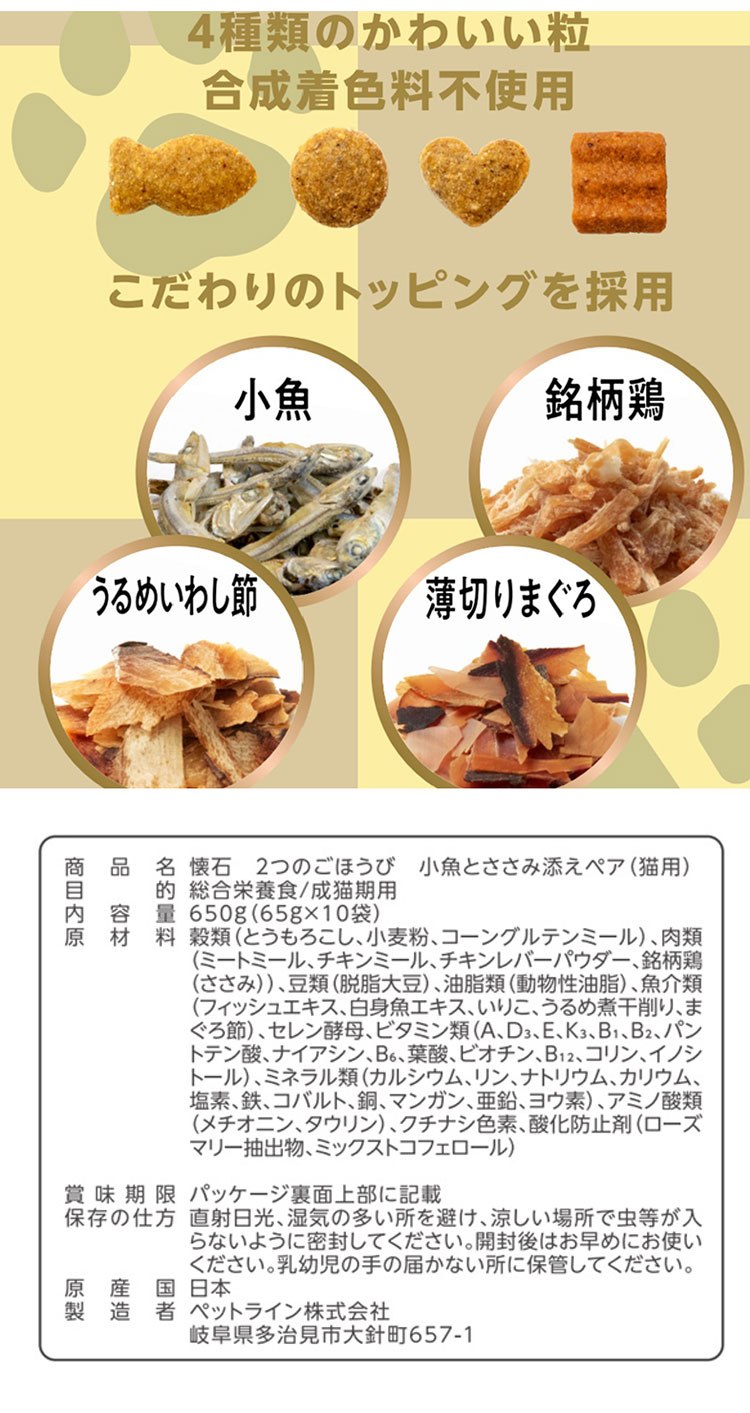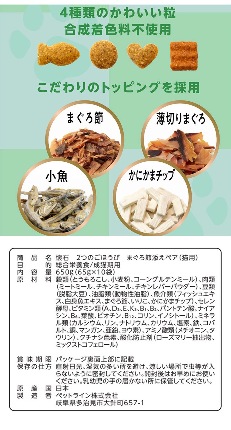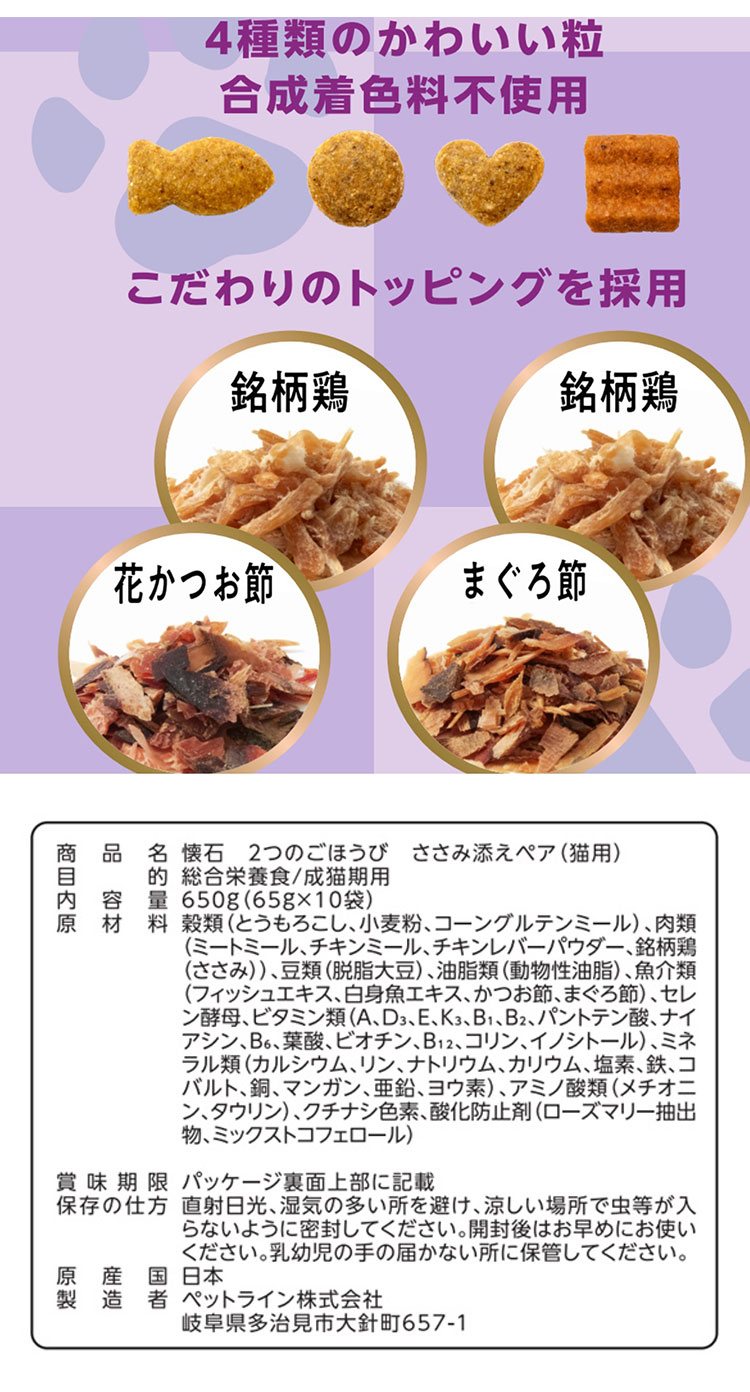 ペットライン 懐石 2つのごほうび フレーバータイプ 650g 小分けパック 猫用 猫 キャットフード ドライ かつお節添え
