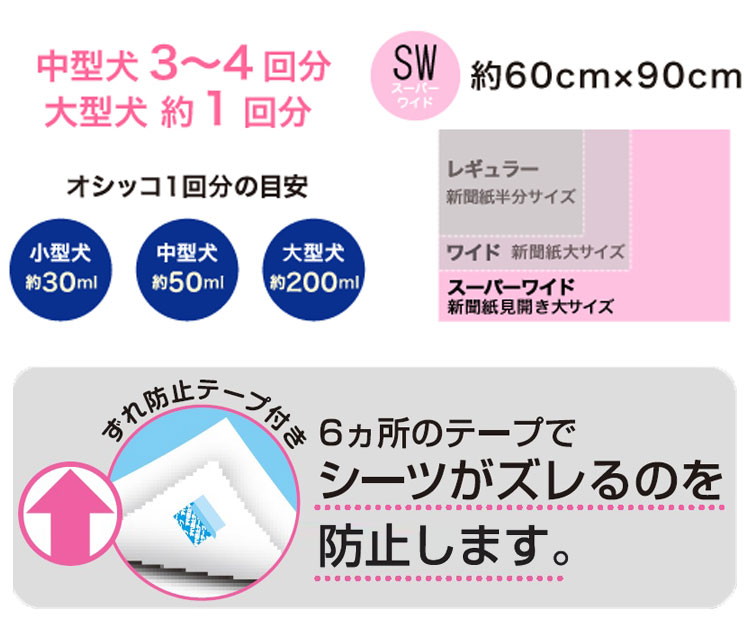 | サイズ/寸法 | ワイド 製品サイズ(外寸):約43×60cm 吸収体サイズ:約38×56cm スーパーワイド 製品サイズ(外寸):約60×90cm 吸収体サイズ:約56×85cm |