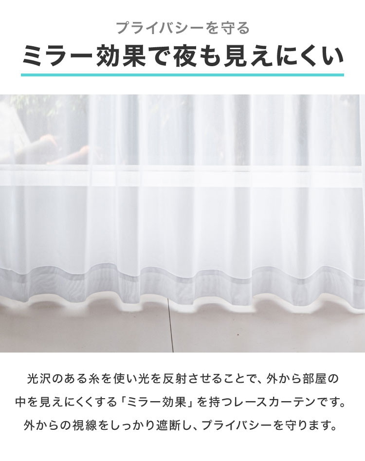 外から部屋の中を見えにくくする「ミラー効果」を持つレースカーテンです。