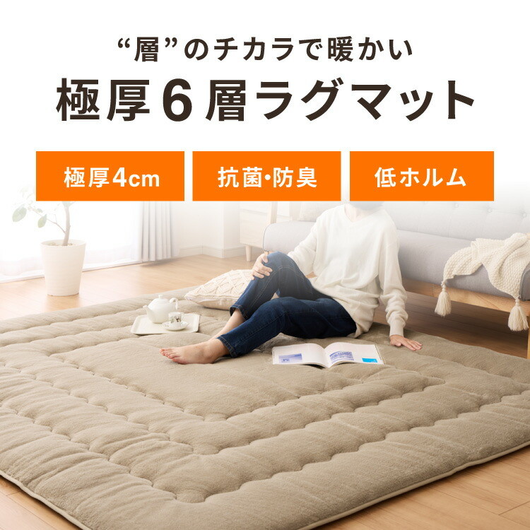 極厚6層ラグ 長方形 抗菌 防臭 厚さ約4cm ラグマット 厚手 滑り止め付 こたつ用敷き布団 ベージュ 130×185cm