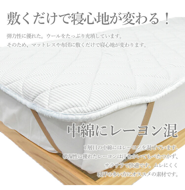 2層式ウールベッドパッド シングル 100×200cm ホワイト デオメタフィプレミア加工 抗菌防臭 洗濯可能 洗える