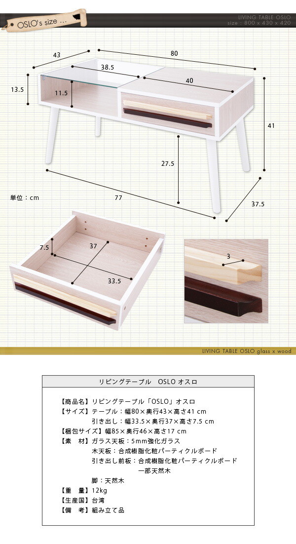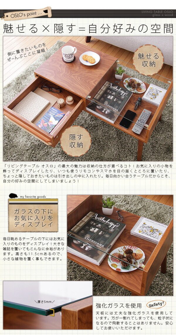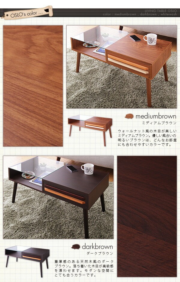テーブル ウォールナット ガラス 木製 ローテーブル 引き出し 北欧 OSLO 【リビングテーブル オスロ】 ホワイトウォッシュ