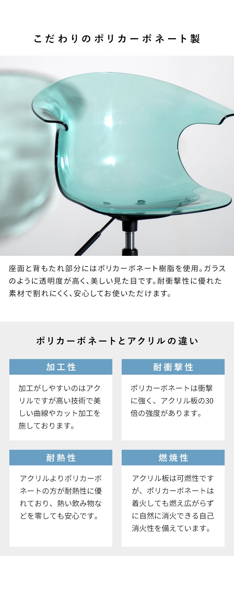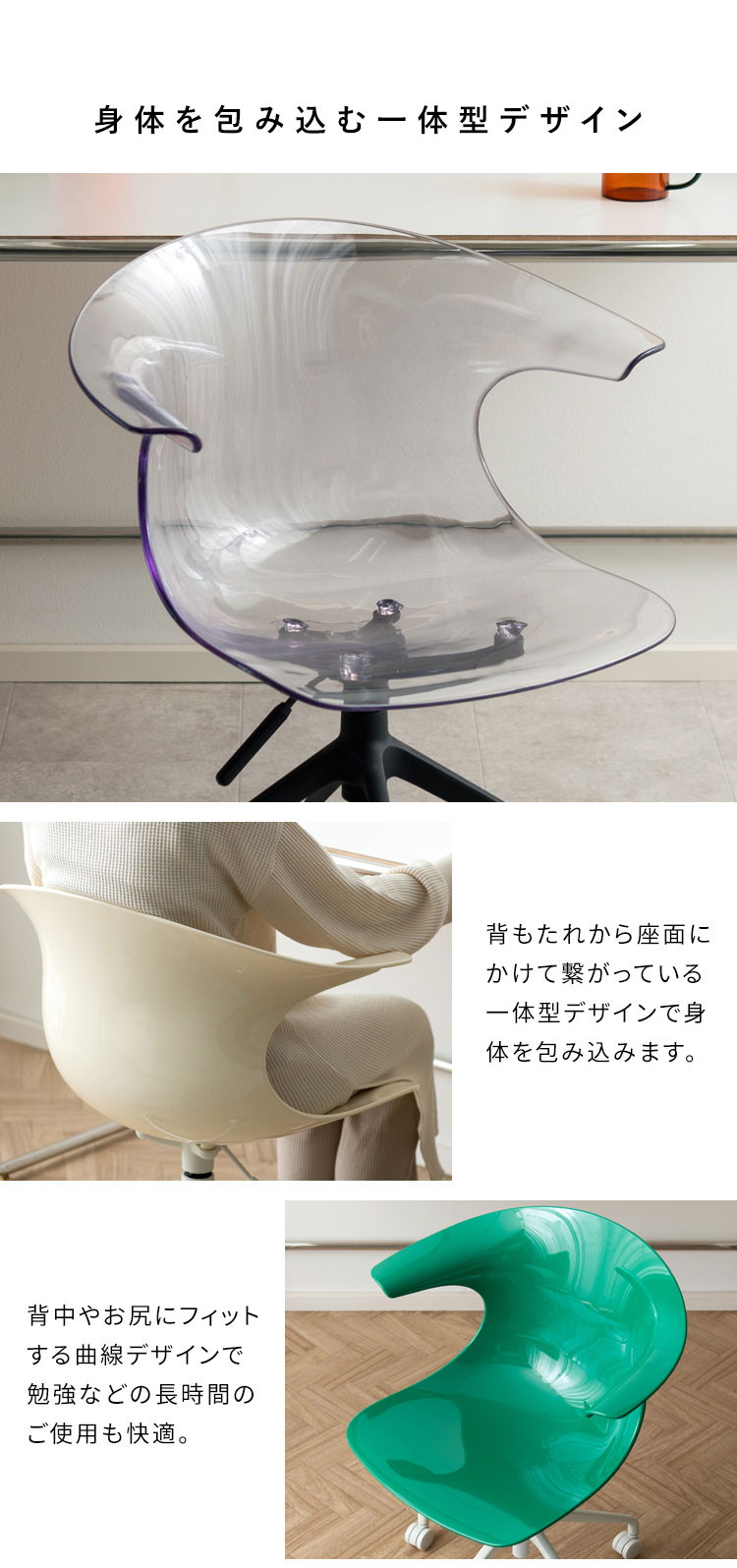 強度の高いポリカーボネート製の座面は背もたれ一体型でゆとりをもってお座りいただけます。